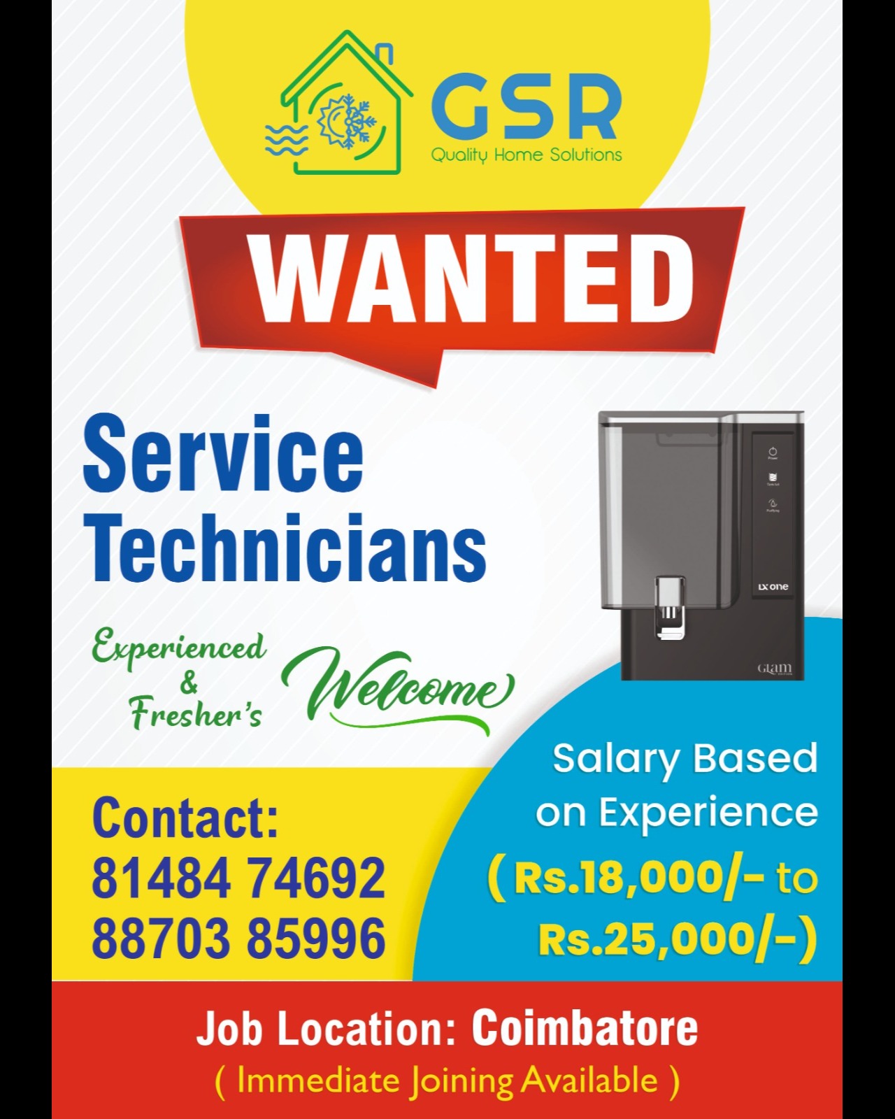 Join our growing service team! Location: Coimbatore Experience preferred (Freshers can apply) Two-wheeler Licence & Android Mobile mandatory Attractive Salary (Negotiable) πŸ“ž Contact: 8148474692